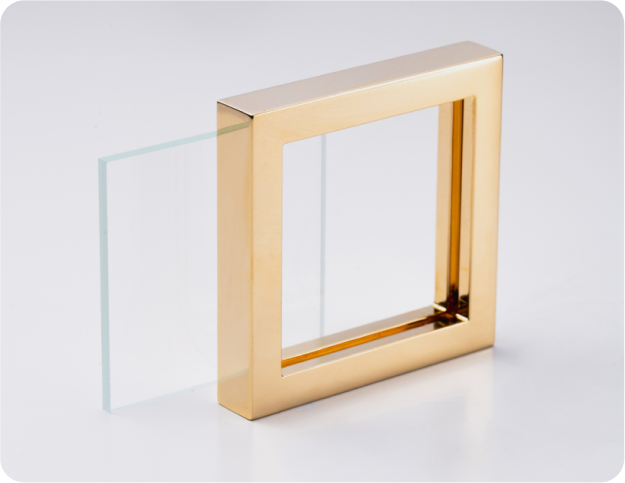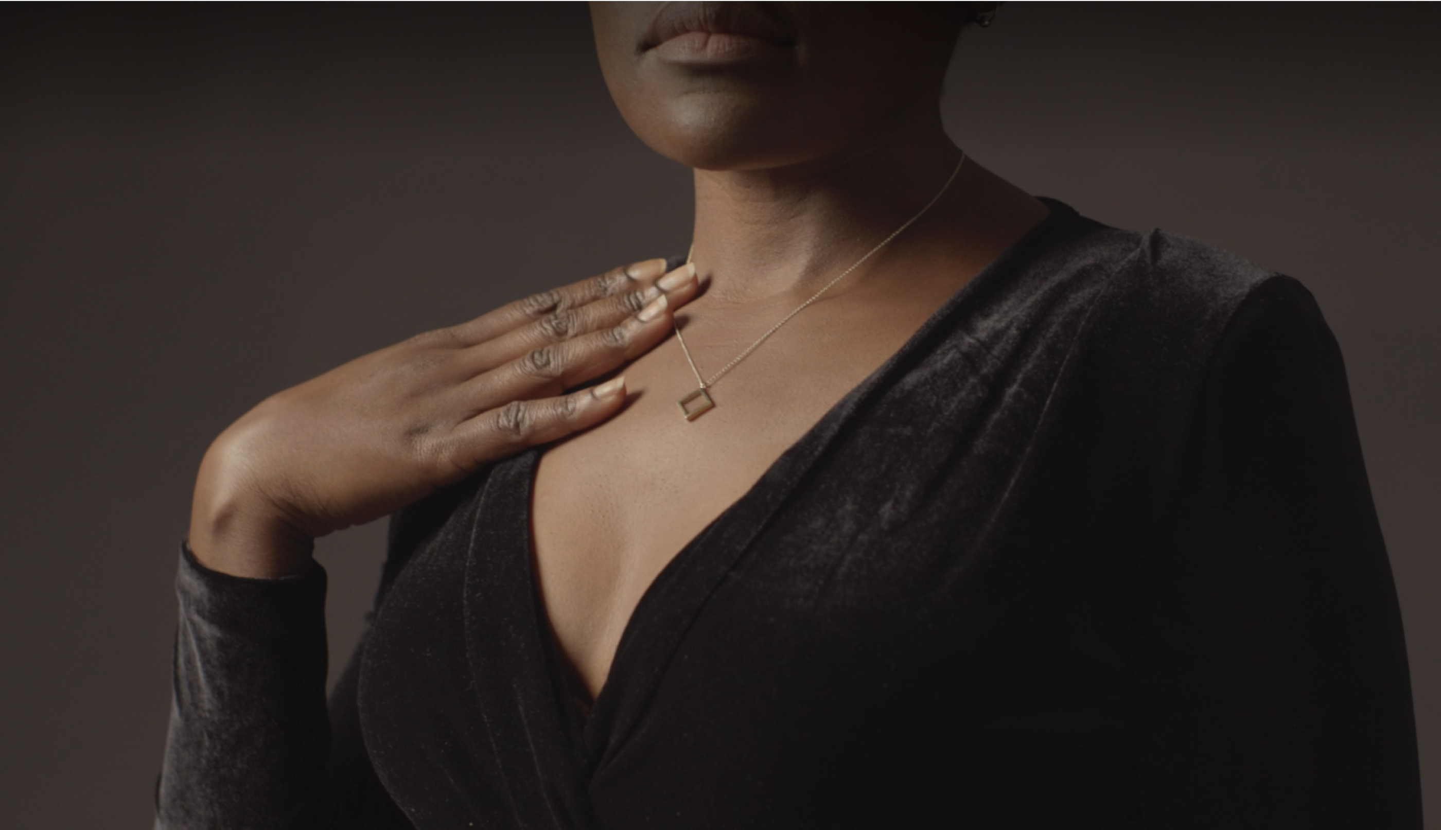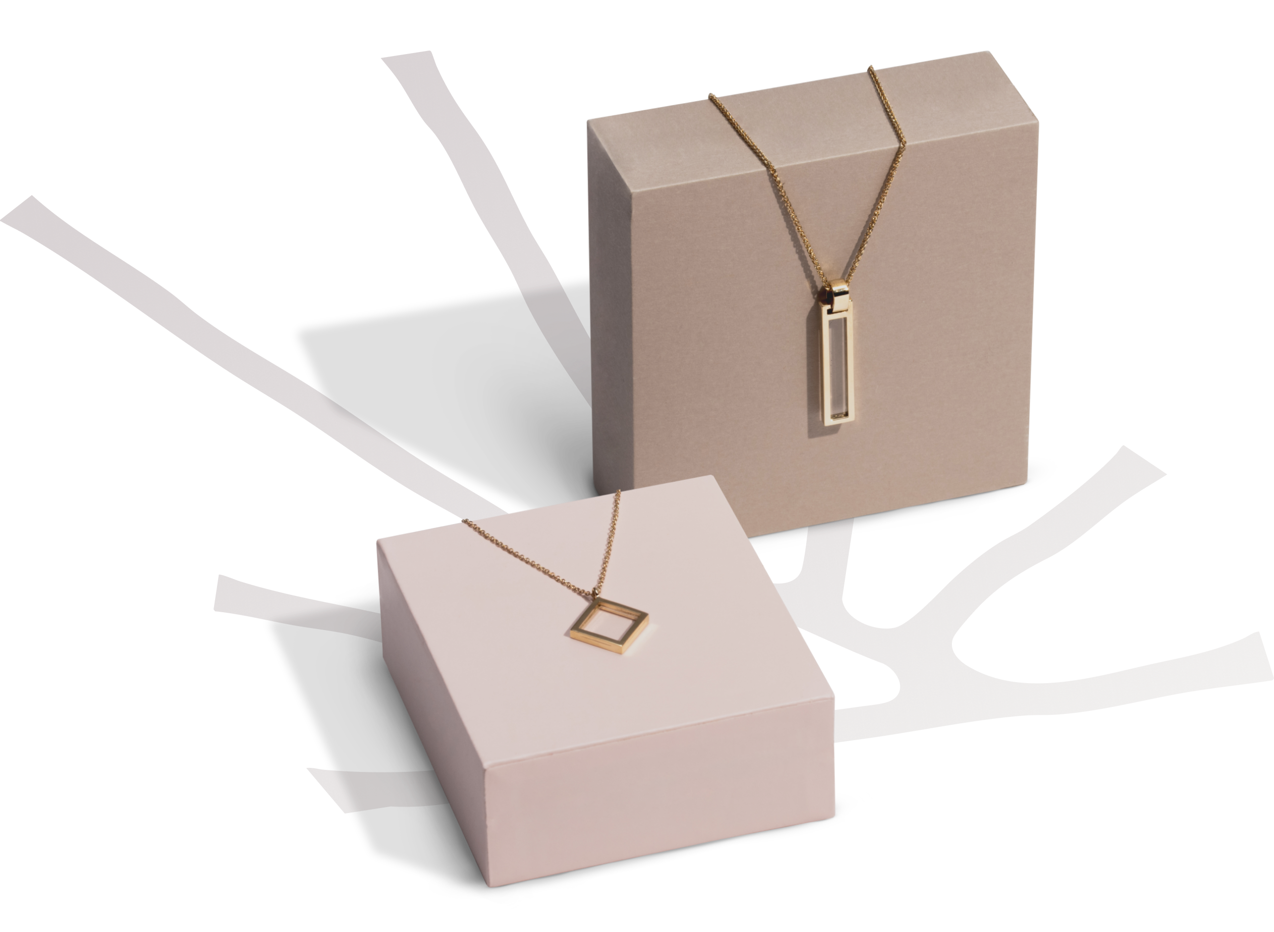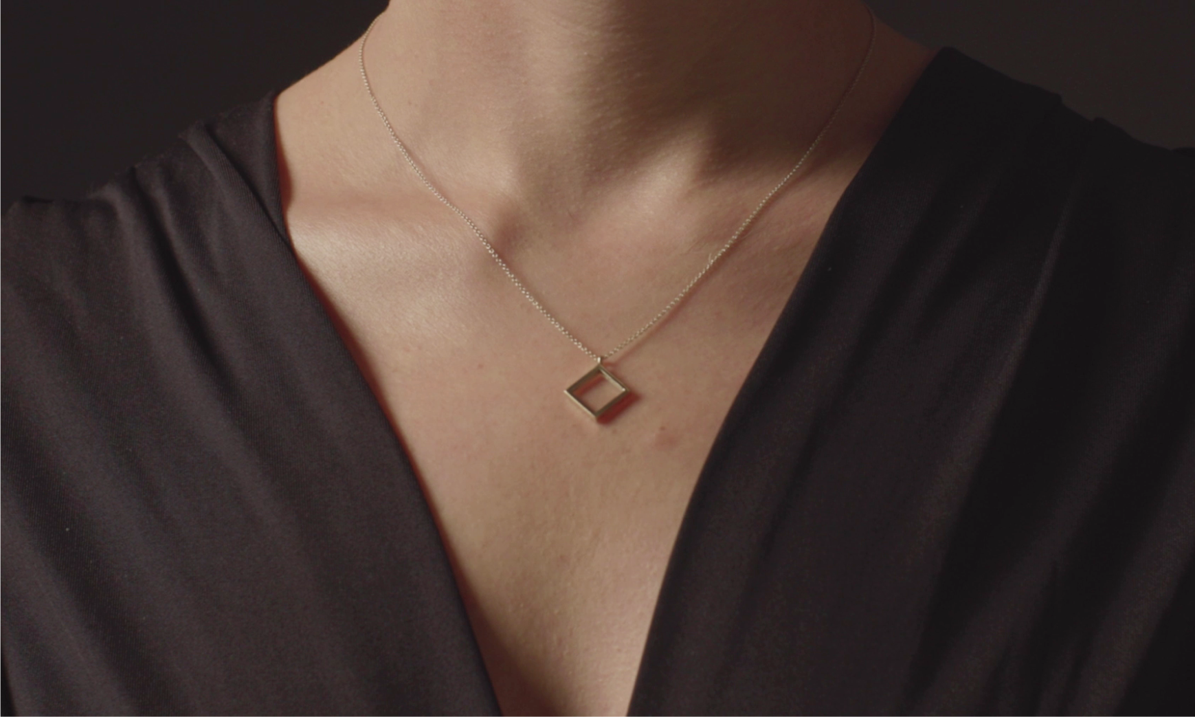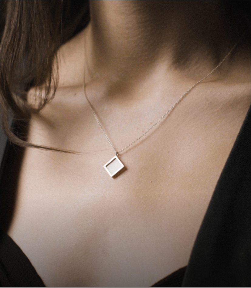 The women's model with an elegant and feminine design; square shaped and set at a 45-degree angle. The men's model features a more robust, elongated rectangle form with thicker borders and hangs vertically.