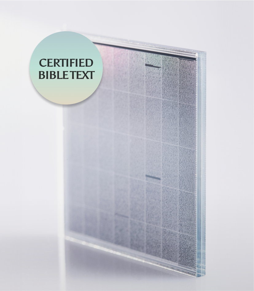 All 66 books (39 in the Old Testament & 27 in the New Testament), 783,137 words and 3,116,480 printed letters engraved using the world's most advanced technology on a 9x9 transparent gemstone.